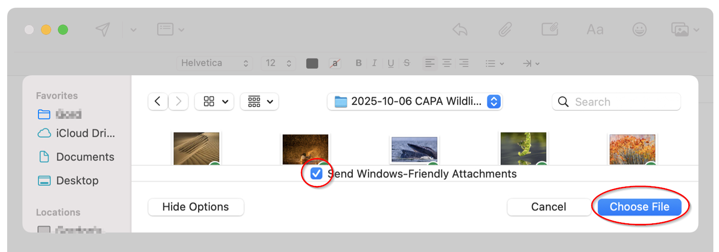 In addition, we have occasionally found that images from Apple Mail users end up too small. This is usually a setting in Apple Mail. When clicking on the “Send” button, please choose “Actual Size” as is shown below.
